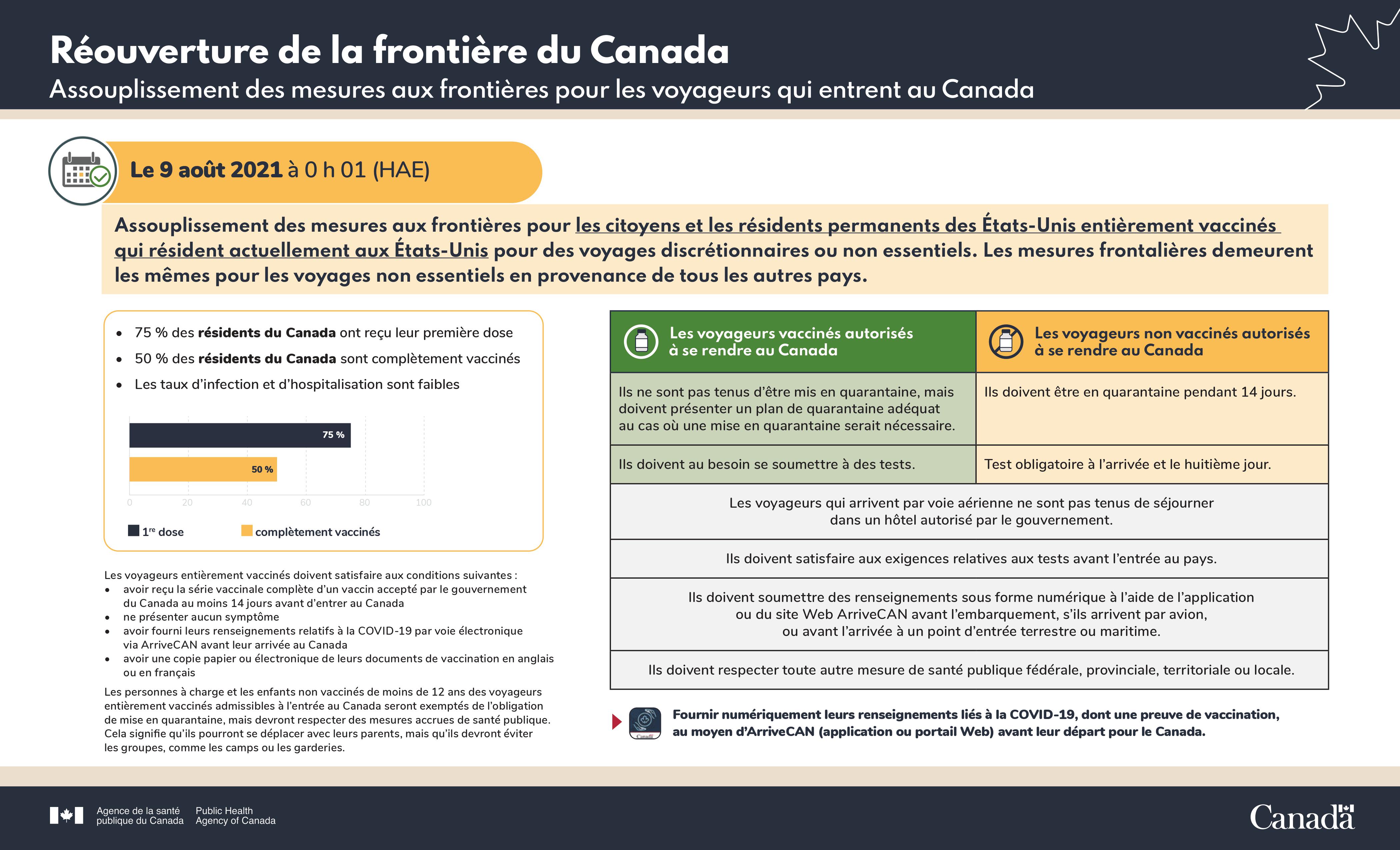 Tous les voyageurs doivent utiliser ArriveCAN (application ou portail Web), récemment mis à jour pour inclure la capacité de téléchargement de la certification de vaccination, pour soumettre leurs informations de voyage. Les voyageurs entièrement vaccinés admissibles à entrer au Canada et qui répondent à des critères spécifiques n’auront pas à se mettre en quarantaine à leur arrivée au Canada. Comme annoncé le 21 juin, l’exigence de quarantaine a déjà été abandonnée pour les Canadiens entièrement vaccinés et les résidents permanents de retour au Canada depuis le 5 juillet.