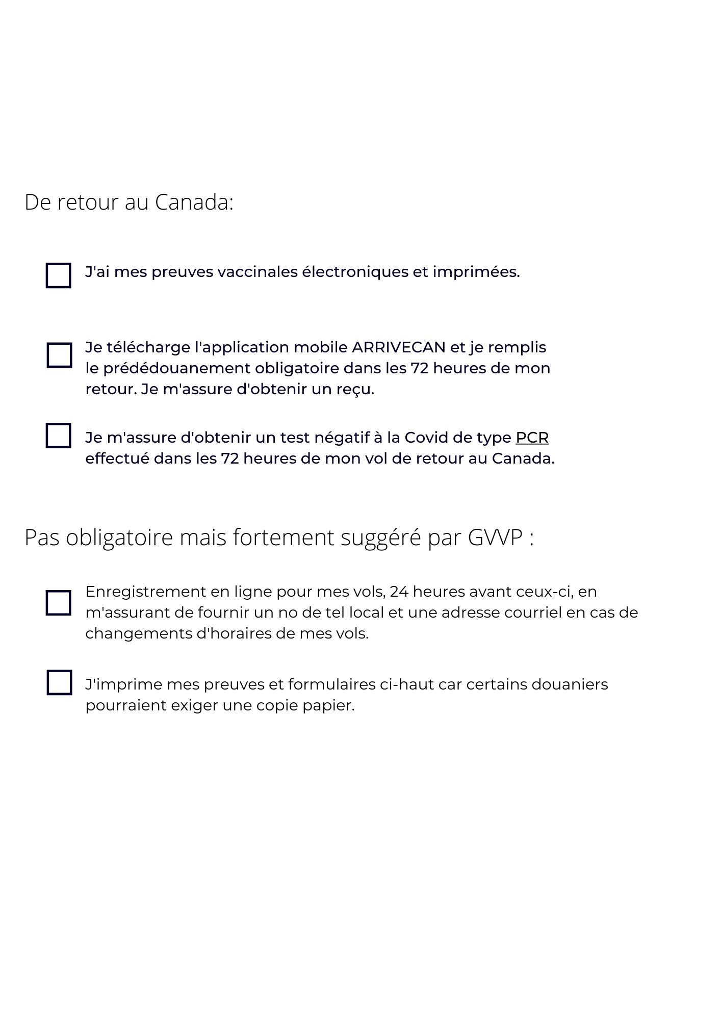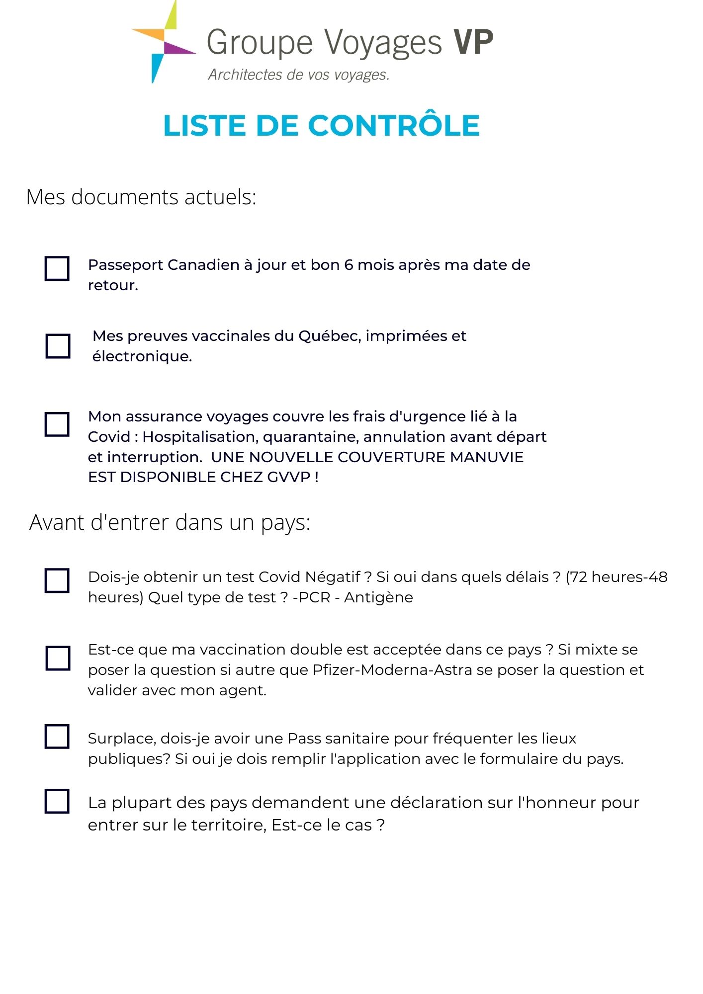 Les compagnies aériennes ont leur portail ou outil de vérification, mais ils ne sont pas complets. Voici une liste de vérification à discuter avec votre conseiller en voyages.