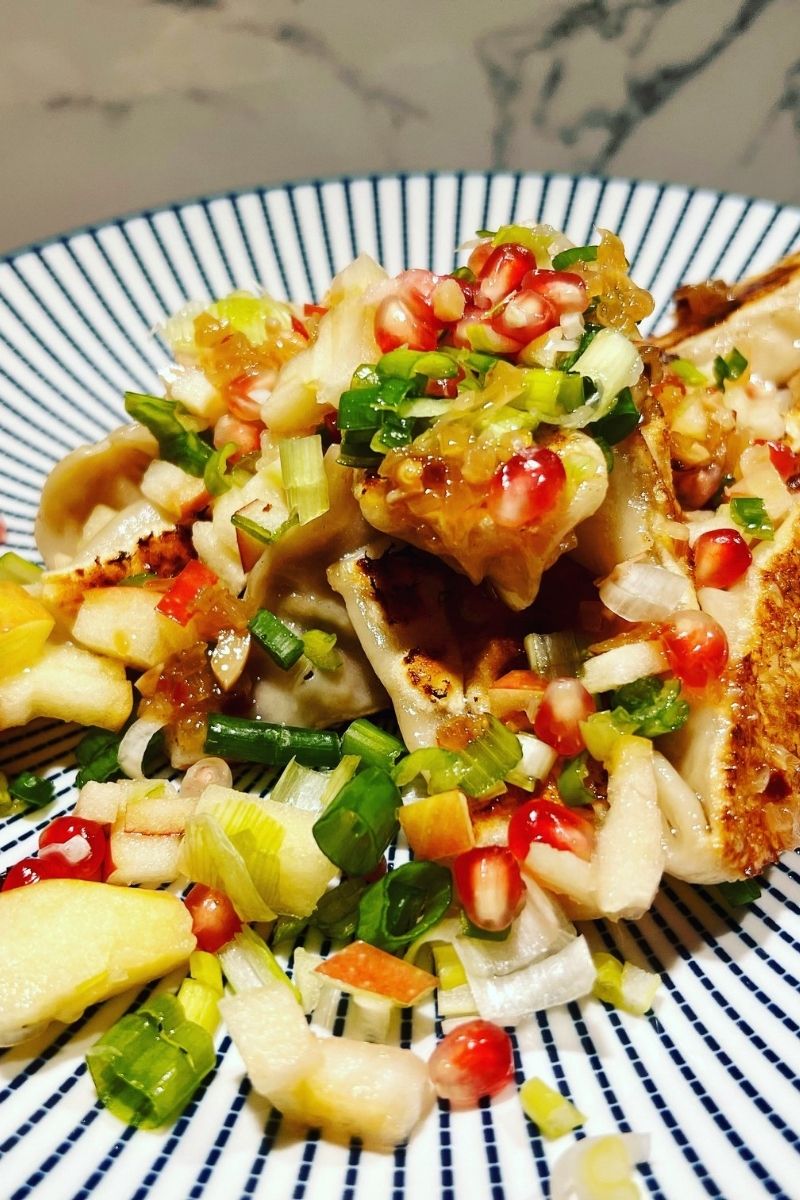 5.Au moment de servir, parsemer les dumplings des grains de pomme grenade, de la pomme et de l’oignon vert. Accompagner d’une sauce piquante Siracha maison.