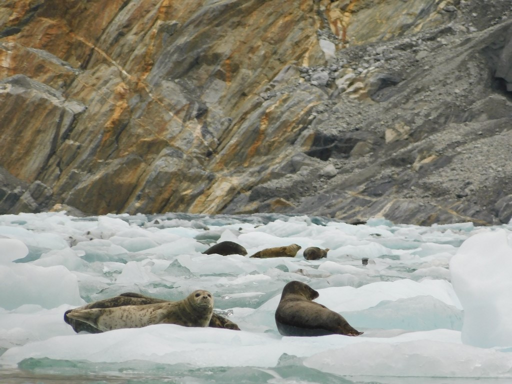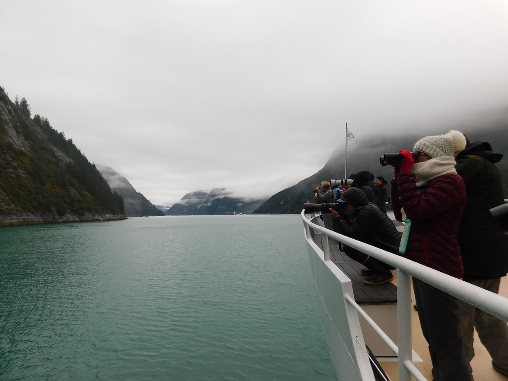 Lorsque nous sommes arrivés à Ketchican, l’aventure a débuté en sortant de l’aéroport puisque nous devions prendre un ferry pour nous rendre en la ville. Cette petite ville de 15,000 habitants est la capitale mondiale du saumon. C’est l’endroit rêvé pour les pêcheurs. Elle attire aussi 800,000 croisiéristes durant l’année. Vous pouvez visiter le Totem Heritage Center qui permet de voir la plus grande collection de Totems . Il y a de belles petites maisons colorées. Notre bateau d’expédition nous attendait au quai pour notre voyage de 7 jours. Il était petit à côté des immenses navires. Nous étions 54 personnes à bord (des Américains, Canadiens, Européens, et 2 couples d’Afrique du Sud). Nous nous sommes liés d’amitié avec plusieurs personnes, car tout le monde se retrouve en même temps en train de manger ou dans le lounge ou sur le pont pour observer les animaux. Il y a 3 étages de cabines. La nôtre était au premier étage, elle n’était pas grande, mais le lit queen était très confortable, la salle de bain était petite, mais on fait avec puisque nous passons très peu de temps dans notre cabine. On ne fait pas cette croisière pour les chambres, mais surtout pour toutes les expériences qui nous sont offertes, le personnel est passionné et la nourriture exceptionnelle, nous sommes revenus avec quelques kilos en surplus.