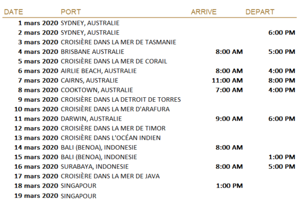 Croisière de 18 jours à bord du Seven Seas Mariner au départ de Sydney. Un bel itinéraire pour découvrir les plus belles villes d’Australie, vous laisser envoûter par Bali et l’île de Java et enfin finir dans l’effervescente ville de Singapour dans un cadre élégant, avec une formule tout inclus.