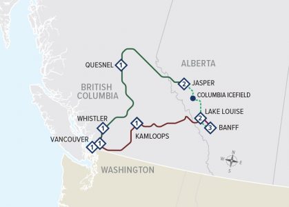 Un voyage épique sur les de deux chemins de fer uniques de l’ouest canadiens, mêlant une expérience unique à bord du Rocky Mountaineer au travers des sites merveilleux des Rocheuses et des villes les plus emblématiques de l’ouest du Canada.