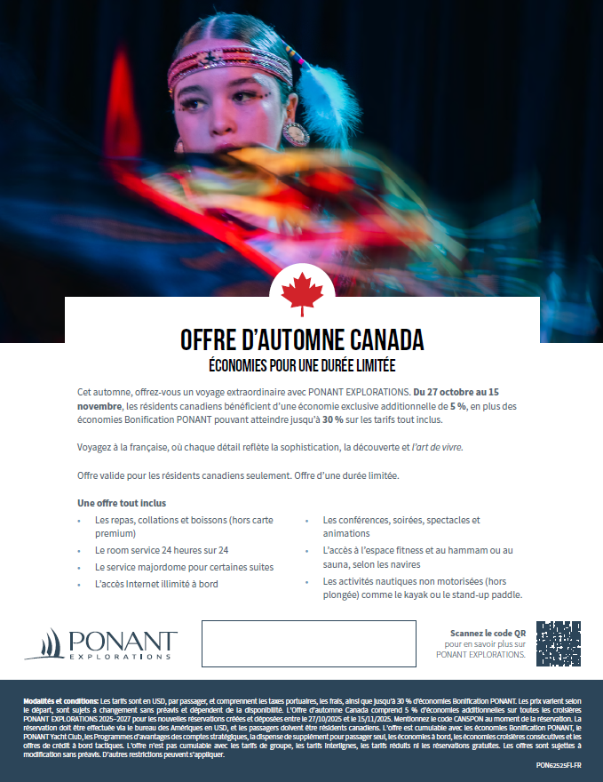 Cet automne, partez à la découverte du monde avec PONANT Explorations, la référence des croisières de luxe à la française. Du 27 octobre au 15 novembre 2025, les résidents canadiens profitent d’une offre exceptionnelle : jusqu’à 30 % d’économies sur les tarifs tout inclus, incluant une réduction additionnelle de 5 % exclusive au Canada.